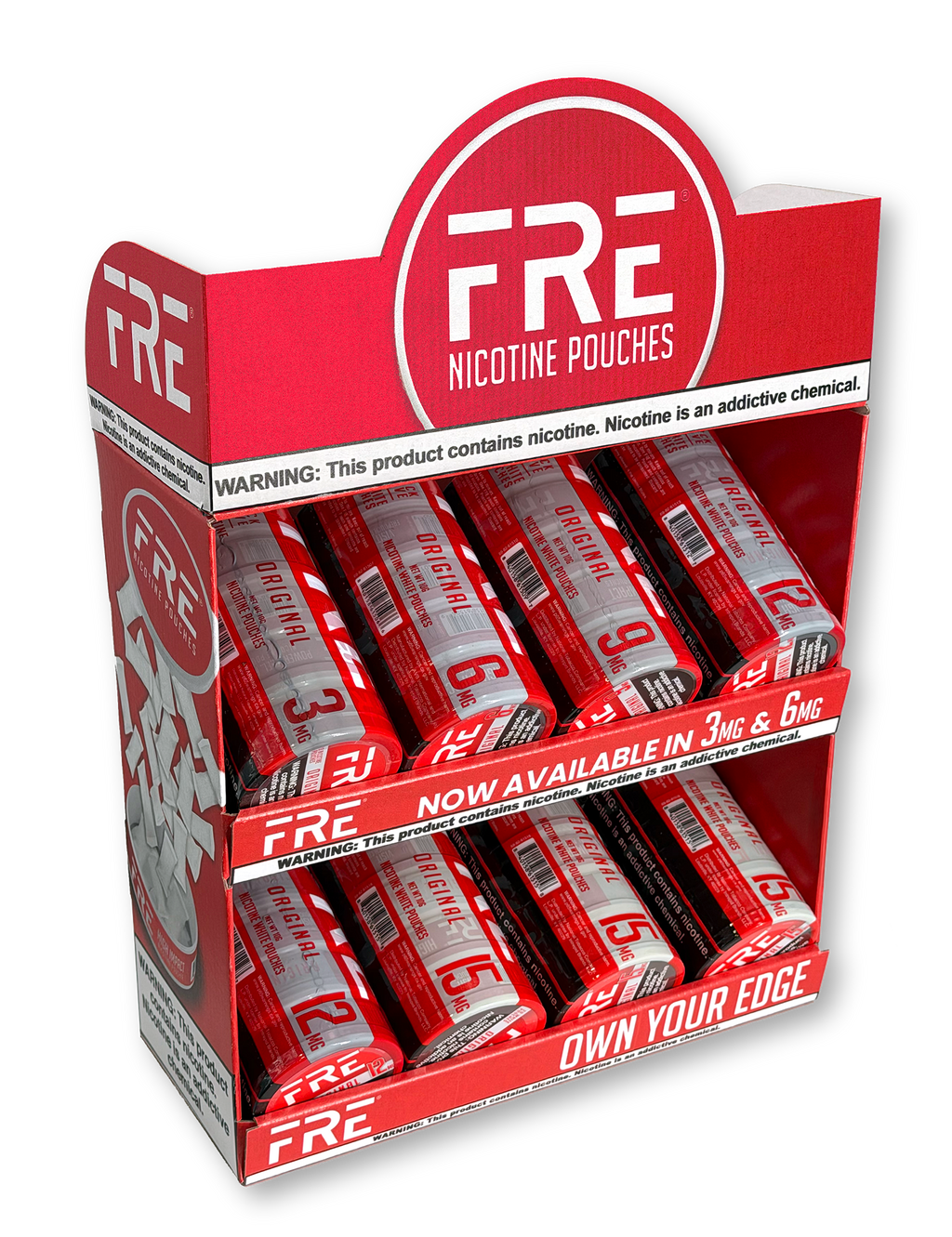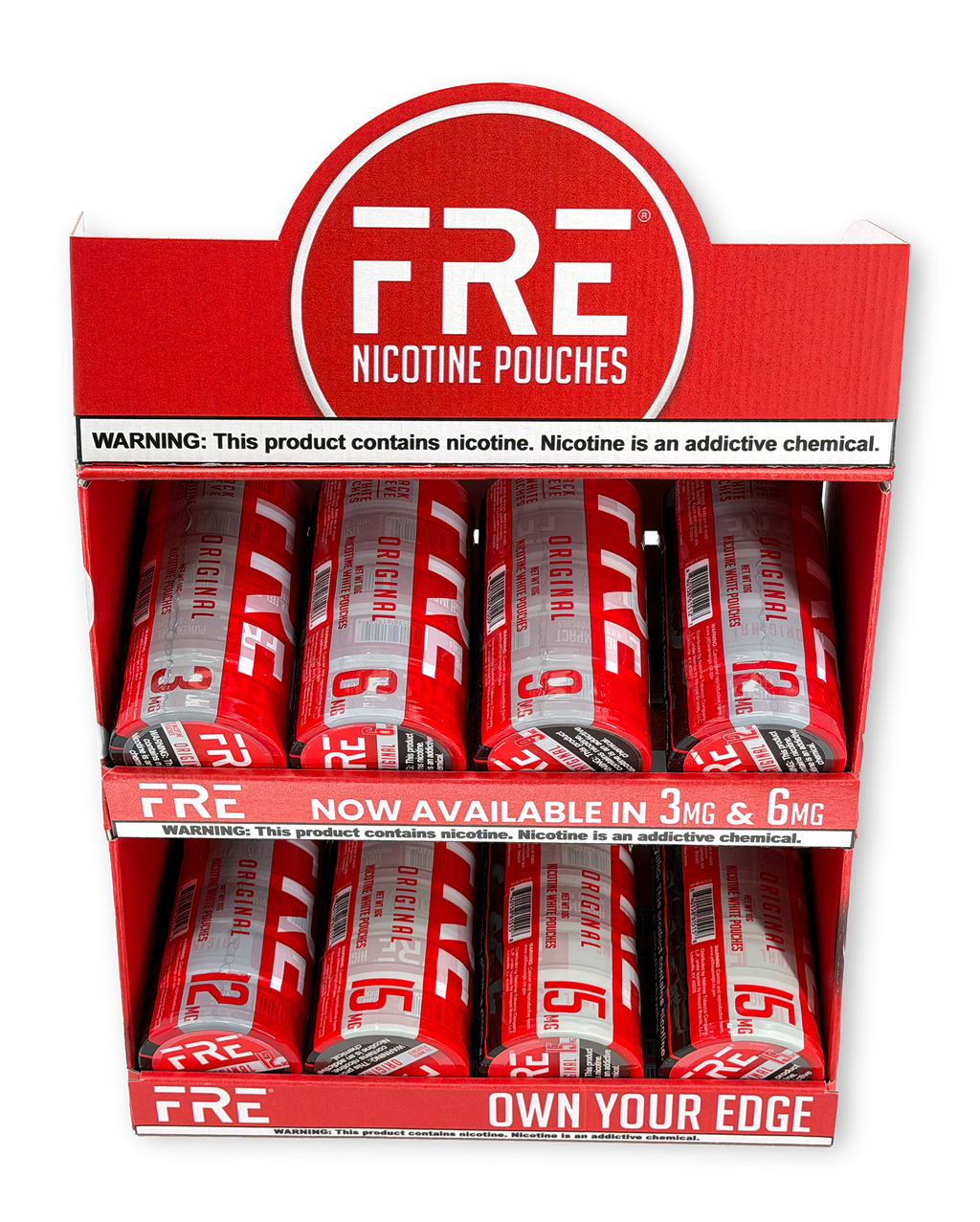 The Original Starter Set is a pre-packed countertop display featuring FRE's Original (unflavored) nicotine pouches only — built specifically for flavor-restricted markets like California. Same easy setup as the Power Set: one barcode, one item, unbox and place. Includes a built-in Buy 6, Get 2 promotion to drive trial and get cans moving from day one. If you're in a market where flavored products can't be sold, this is the fastest way to get FRE on your counter and start turning product.